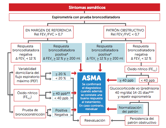 La prueba diagnóstica de primera elección es la espirometría con prueba broncodilatadora. El hecho de tener una espirometría que no presente prueba broncodilatadora positiva, no excluye el diagnóstico de asma. Para completar el estudio e intentar llegar al diagnostico de asma también se pueden realizar mediciones de la variabilidad o fluctuación excesiva de la función pulmonar, la medición de la fracción exhalada de oxido nítrico (FENO) o las pruebas de provocación bronquial.